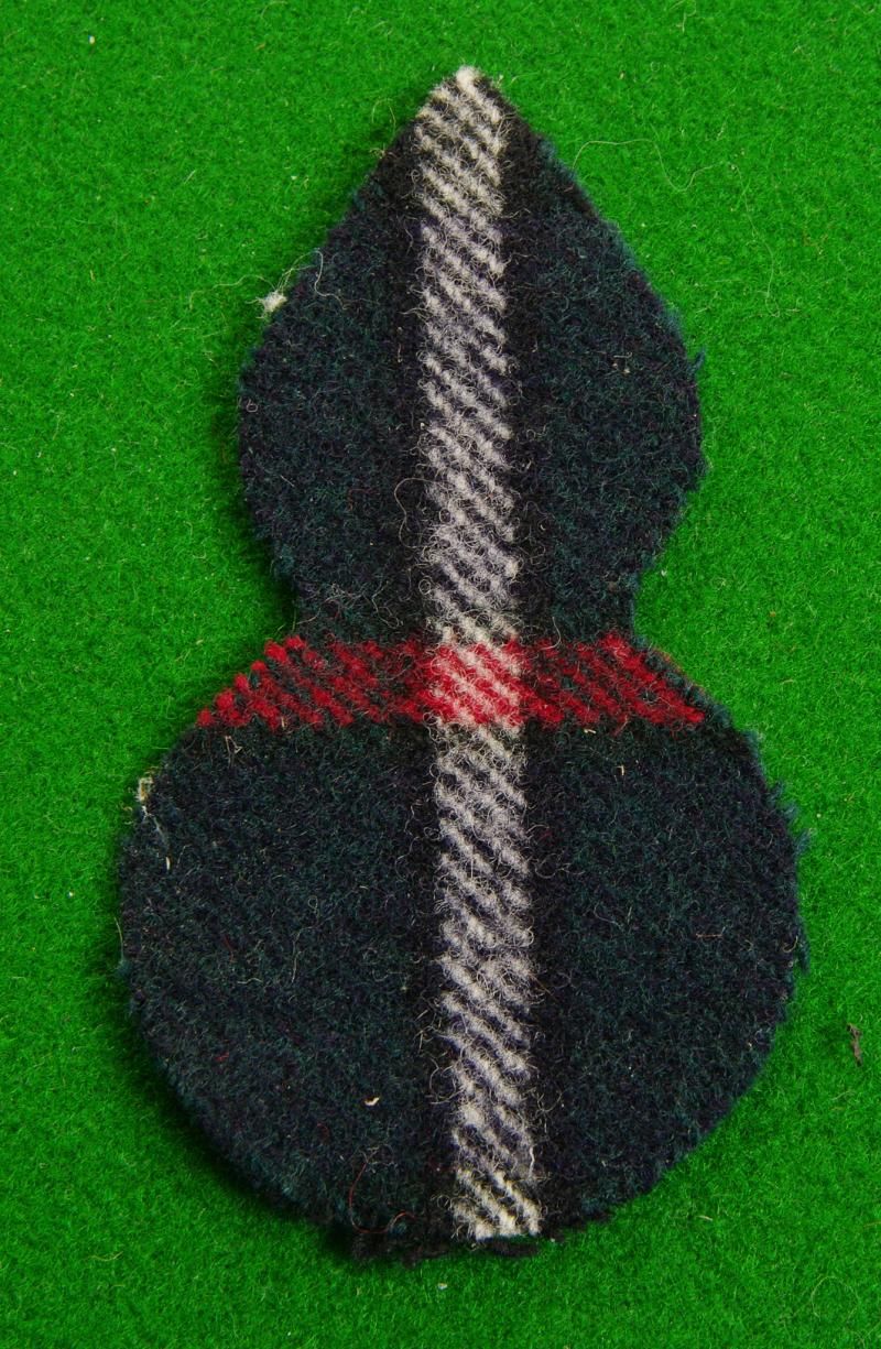 A section of tartan cut to the shape of a Fusiliers fused grenade worn as a formation sign.