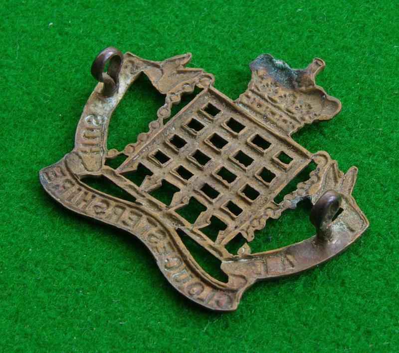 Brass cap badge with two black loops to the reverse. A portcullis surmounted by a coronet taken from the Crest of the Duke of Beaufort above the tri-part furled title scroll.