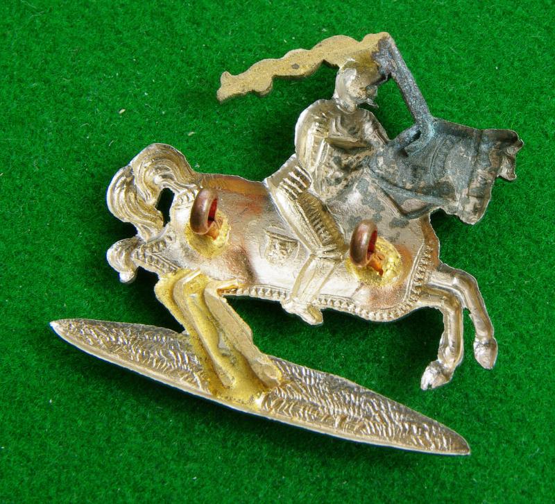 Early pattern white cap badge with two loops and strengthening wires to the helmet plume the sword and the horse's rear legs. The armoured knight the Thain of Fife.{Staining to the reverse of the horse's head}