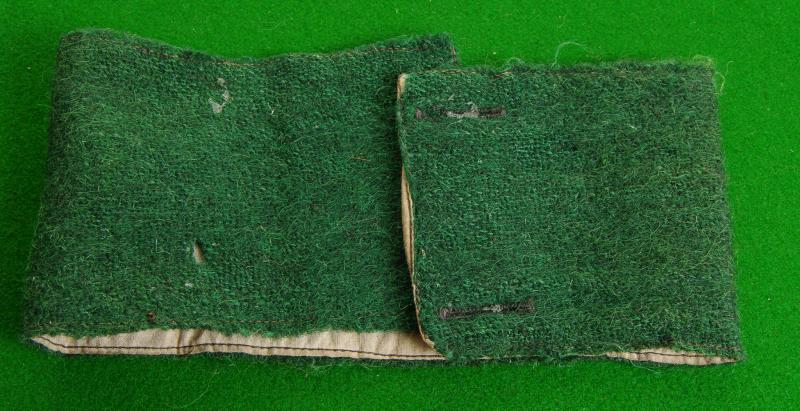 Scarce WW I woollen embroidered armband with buttonhole fittings {buttons absent} and white material lining to the reverse. Three rank chevrons and the large king's crown in red on a dark green armband. {One or two moth nips}