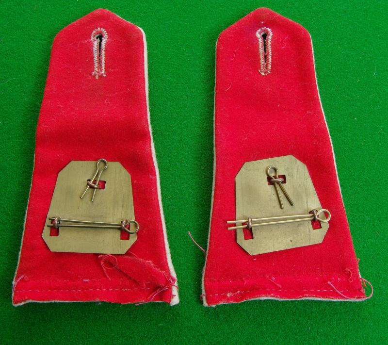 Pair of brass shoulder titles, " T / 5 / Leicester" complete with shaped brass back-plates to the reverse still affixed to a pair of cut-off white shoulder straps. The Leicestershire Regiment wore white facings until the 1930's.