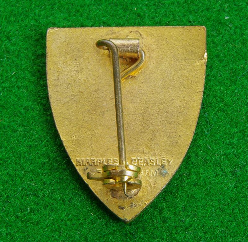 Scarce WW II brass and enamel lapel badge with locking brooch pin fitting and makers detail for Marples & Beasley Birmingham to the reverse. A shield shape bearing the white enamel title, " Beckenham Borough " above the Coat of Arms flanked by the blue enamelled titles, " Salvage Steward"