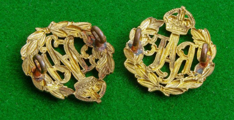 Scarce pair of brass king's crown collar badges only worn for a very short period on the " Prussian Blue " tunic. The "RAF" monogram to the centre of a crowned wreath of laurel.