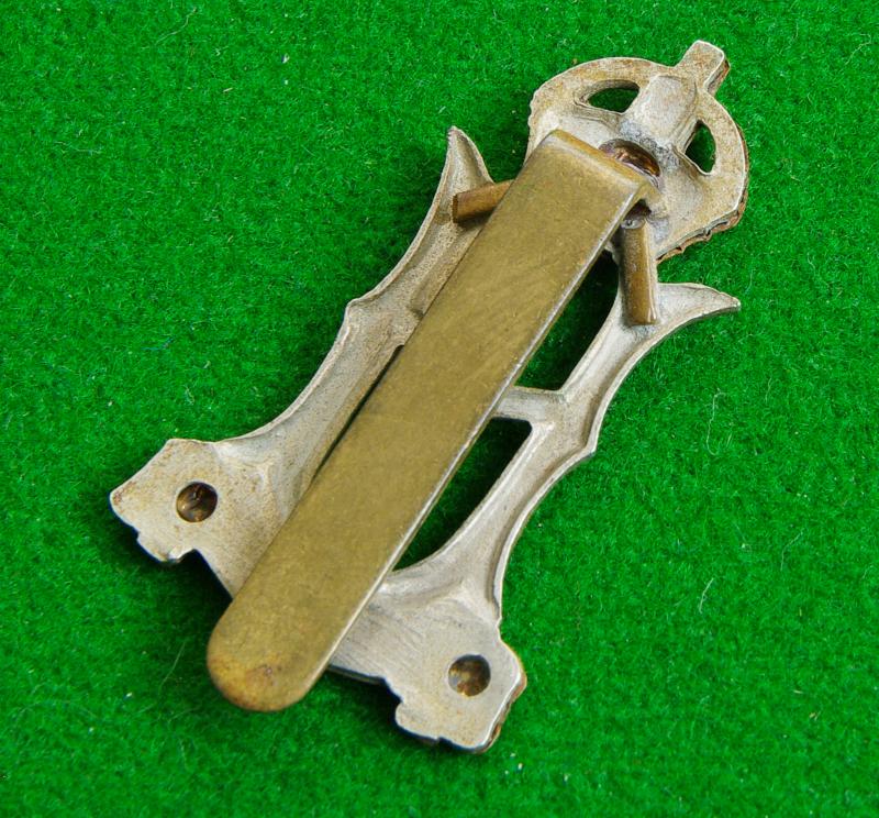 King's crown bi / metal cap badge with slider fitting to the reverse. The crowned capital letter, "H" above the furled scroll, "23rd.Hussars". {Raised in 1940 and disbanded by 1948}