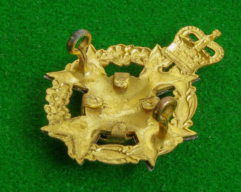 Queen's crow silver gilt and enamel cap badge with two loops to the reverse. A quatrefoil to the centre of a circlet bearing the motto on a ground of dark blue enamel mounted upon a maltese cross within a crowned wreath of oak and laurel.