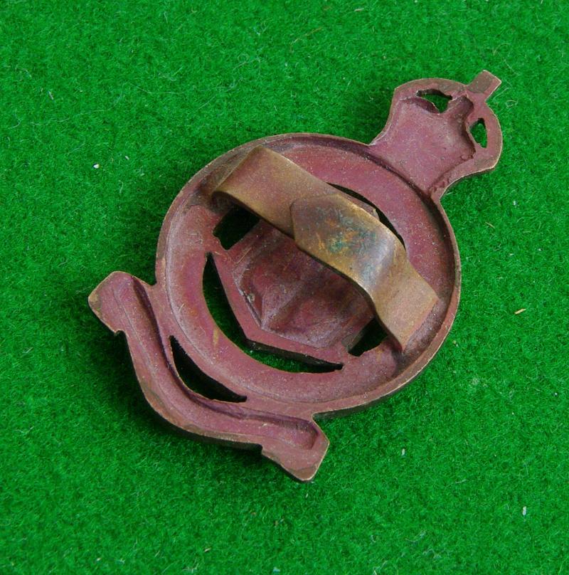 Scarce king's crown officers bronze service dress cap badge with two blades to the reverse. Alnwick Castle to the centre of a crowned circlet bearing the title above the furled South Africa honour scroll.