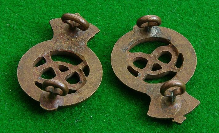 Scarce pair of officers bronze service dress collar badges. The Staffordshire Knot to the centre of a strap bearing the title surmounted by the flat-topped Imperial Crown.