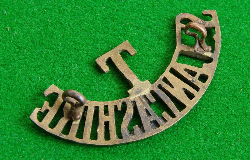Brass shoulder title, " T / S. Lancashire" worn on the greatcoat. {One loop "sprung" but still firmly fixed}