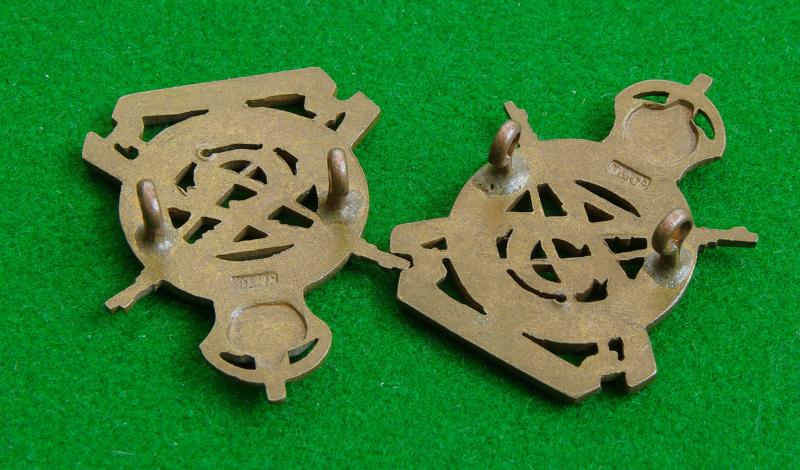 Scarce pair of king's crown officers bronze service dress cap badge size collar badges with makers details for " J & Co." to the reverse. The number, "3" backed by a pair of crossed rifles to the centre of a crowned circlet bearing the title above the furled scroll carrying the South Africa honour.