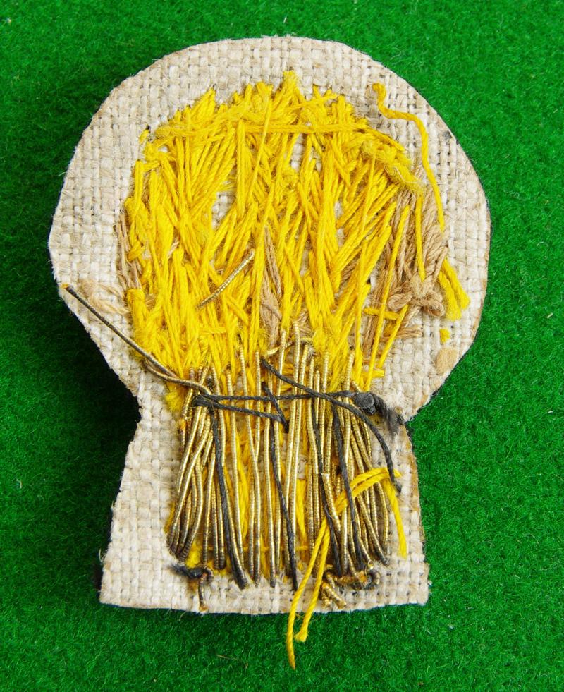 Officers gold bullion wire embroidered beret badge on a dark blue shaped backing. A sheaf of wheat.