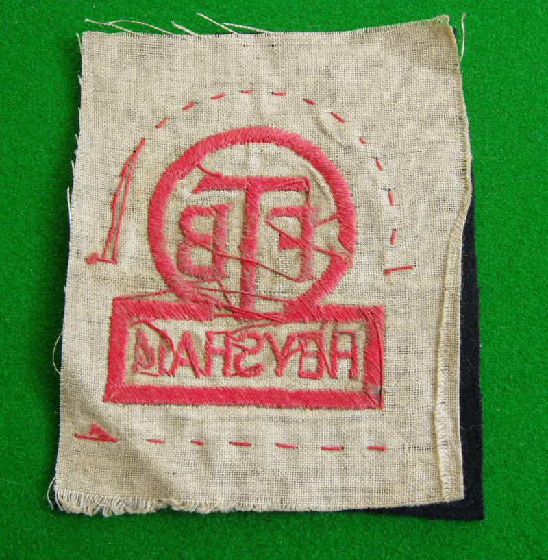Scarce WW II red on black embroidered uncut tunic badge. The initials " T F B " and the title " Heysham" within a red border. Worn by firefighters at Trimpell Ltd. who were producing High Octane Aviation Fuel for the R.A.F. at Heysham Lancashire.