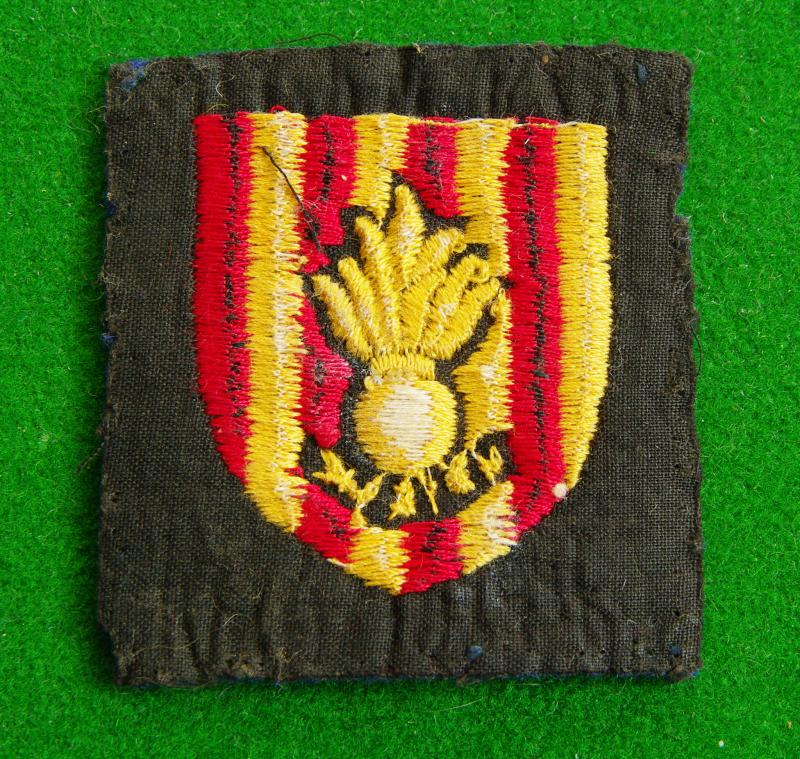 embroidered example of the yellow fused grenade above the motto scroll," Ubique " on a red and yellow striped shield with dark blue backing. Worn by 22 Engineer Group.