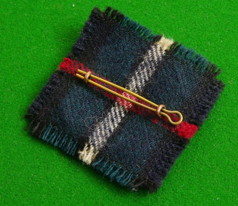 King's crown white metal glengarry badge with two loops and original tartan backing to the reverse. The crown the "HLI" monogram within a curled bugle horn above the motto scroll and the elephant on the Star of the Order of the Thistle.