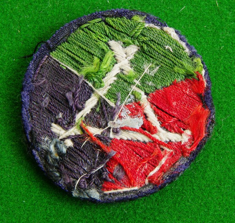 WW II embroidered example of the white geometric design representing three aircraft runways on a green, red and blue circular backing with a black corded trim. Worn by units of the Royal Engineers and the Pioneer Corps tasked with building airstrips for fighter planes in the forward areas. {Cord trim loose}