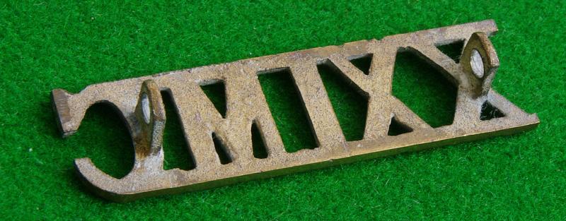 Scarce WW I brass shoulder title, "XXI M C" with two integral lugs to the reverse worn by the 21st. Mule Company Indian Army Service Corps.