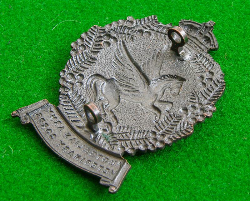 Scarce king's crown black-brass cap badge with two loops to the reverse. A winged horse, {Pegasus} to the centre of a crowned wreath of fern above the furled double title scroll, " Australian Army / Veterinary Corps"
