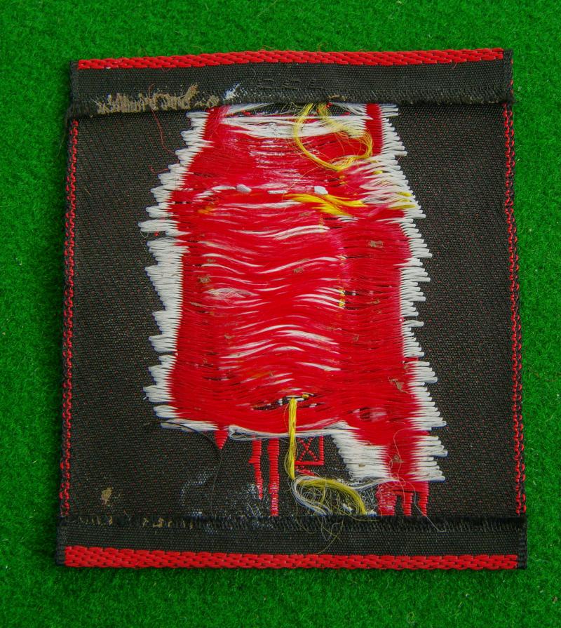Scarce silk woven example of the head of a Native American Medicine Man on a scarlet background. Worn by British Troops at the Batus Training Centre, Suffield Canada.